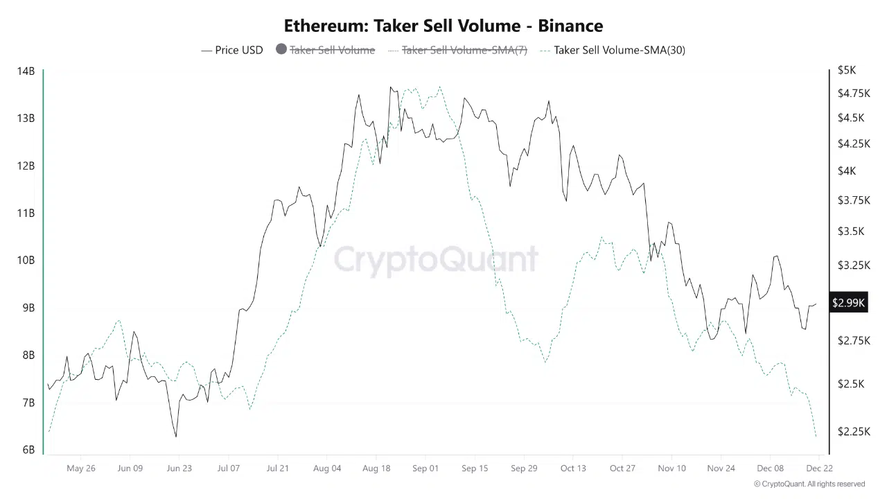 The chart shows that the 30-day moving average of Ethereum taker sell volume on Binance has declined to roughly $6.3 billion, marking its lowest level since May. T